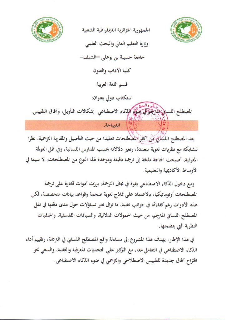 استكتاب دولي بعنوان: المصطلح اللساني المترجم في ضوء الذكاء الاصطناعي: إشكالات التأويل وآفاق التقييس. آخر أجل لإرسال المقالات كاملة 30