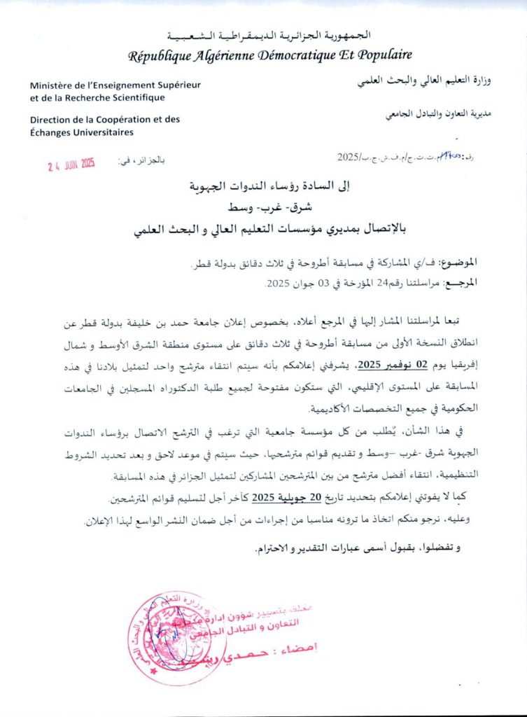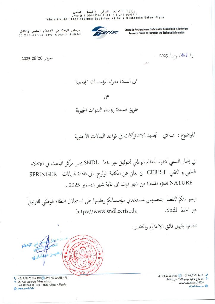 في إطار إثراء النظام الوطني للتوثيق عبر الخط SNL، يشرفنا إعلام جميع الأساتذة الباحثين وطلبة الدكتوراه أنّه يمكنهم الولوج إلى قواعد البيانات الأجنبية، وعلى وجه الخصوص قاعدة البيانات SPRINGER NATURE وذلك ابتداءً من شهر أوت إلى غاية شهر ديسمبر 2025. وعليه ندعو كافة الأساتذة الباحثين وطلبة الدكتوراه إلى استغلال هذه الخدمة الهامة عبر الرابط التالي: https://www.sndl.cerist.dz مع متمنياتنا بالتوفيق للجميع.