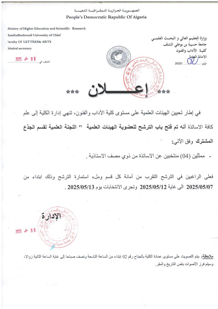 آخر أجل لاستلام الملخصات :10/07/2025. آخر أجل لاستلام البحوث كاملة:15/09/2025 ترسل المشاركات إلى البريد الإلكتروني :h.karouche@fla.univ-chlef.dz