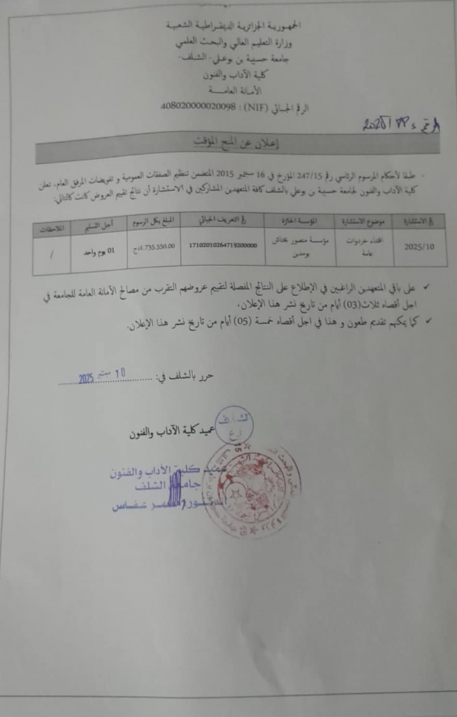 صفقات عموميةإعلان عن المنح المؤقت للإستشارة رقم 12/2025 / 20 نوفمبر، 2025 عدم جدوى للحصة رقم 01 (اقتناء عتاد وأثاث المكاتب).