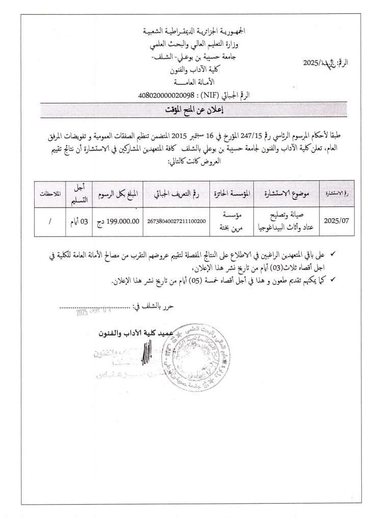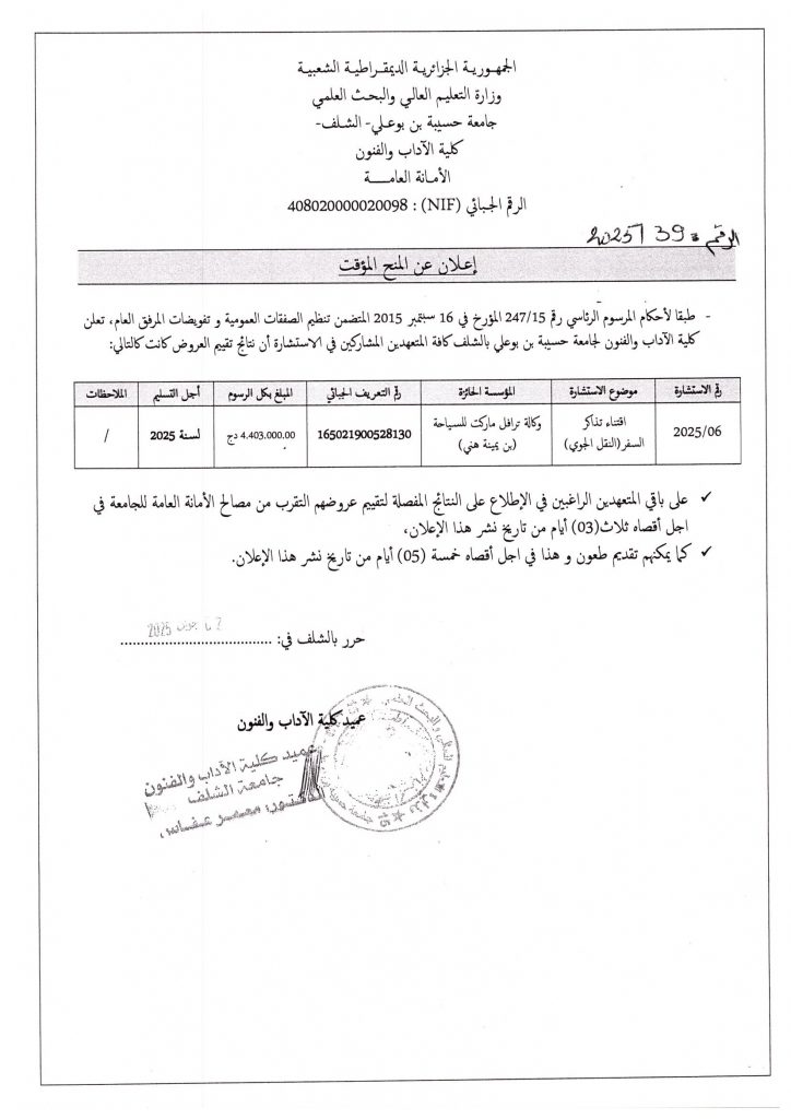 إعلان عن المنح المؤقت للإستشارة رقم 07/2025