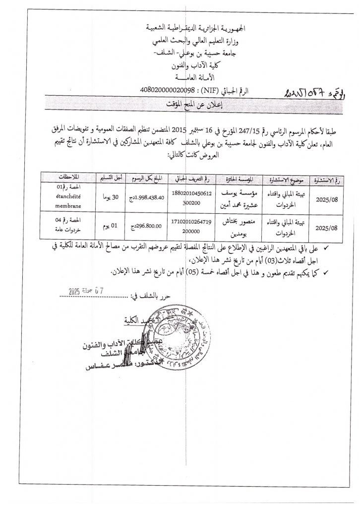 إعلان عن المنح المؤقت للإستشارة رقم 08/2025