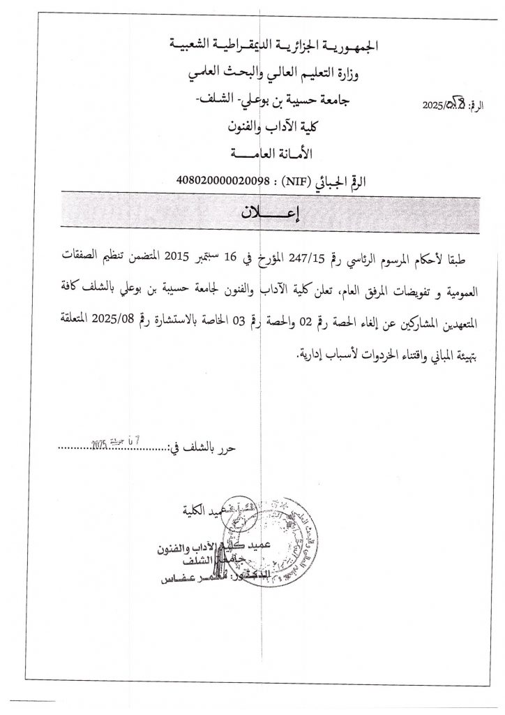 الغاء الحصة رقم 02 والحصة رقم 03 الخاصة بالاستشارة رقم 08/2025