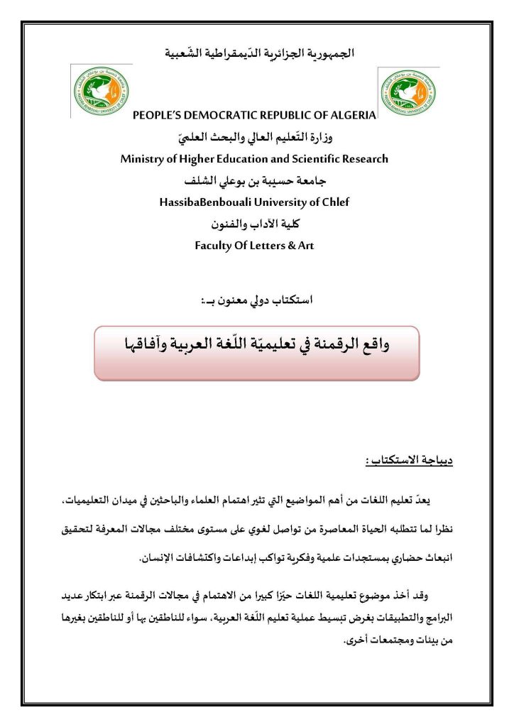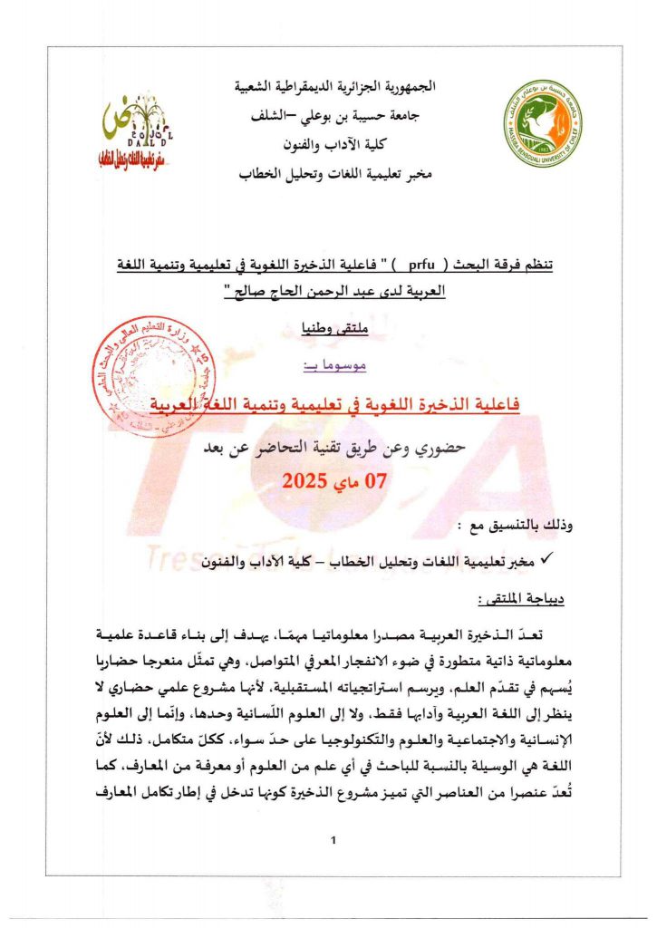 ملتقى الوطني الحضوري وعن بعد الموسوم: “واقع تعليمية اللغة العربية في المرحلة الابتدائية بالجزائر.
