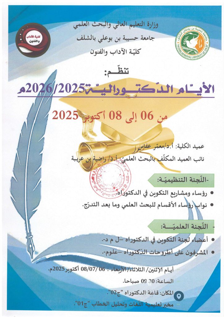 تنظم كلية الآداب والفنون ومخبر تعليميّة اللغات وتحليل الخطاب بجامعة حسيبة بن بوعلي الشلف بالتنسيق مع المجلس الأعلى للغة العربية.