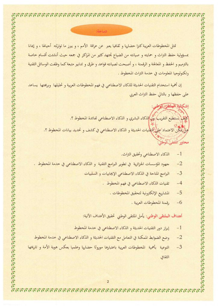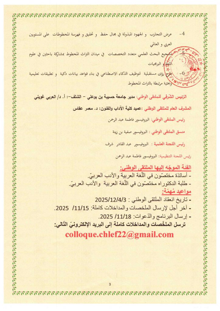 ملتقى وطني حول إحياء المخطوطات العربية من الحبر الى تقنيات الذكاء الاصطناعي .بواسطة / 7 يوليو، 2025 يومي 3-4/ ديسمبر 2025 تحميل