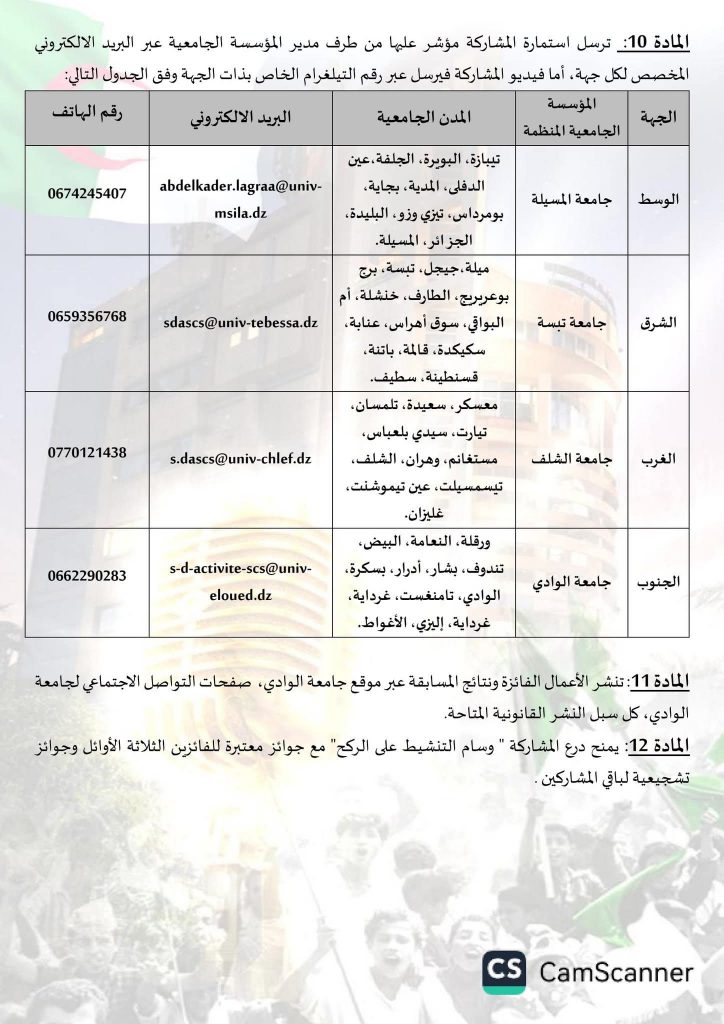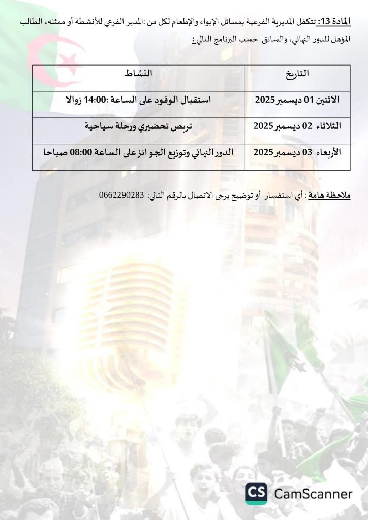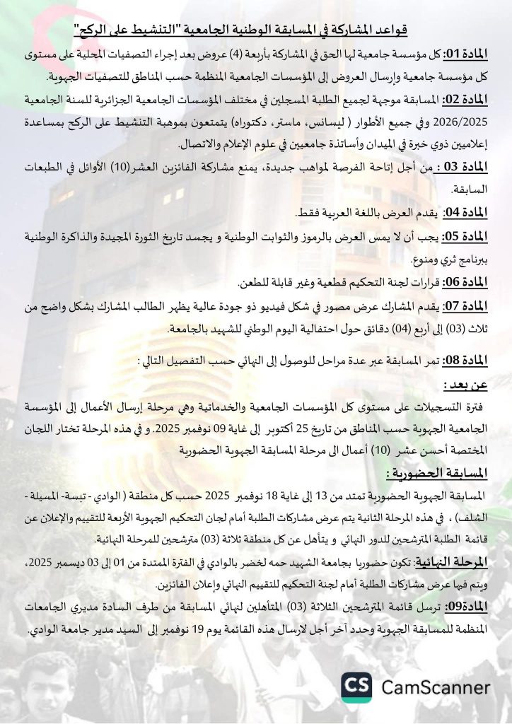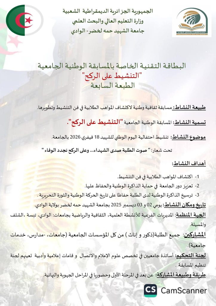 تعلم المديرية الفرعية للانشطة العلمية الثقافية و الرياضية جميع طلبة جامعة حسيبة بن بوعلي الشلف الراغبين في المشاركة و تمثيل الجامعة في الطبعة السابعة للمسابقة الوطنية الجامعية “التنشيط على الركح” التقرب من مصالح الانشطة العلمية الثقافية و الرياضية على مستوى الكليات و المعهدين أو مقر المديرية الفرعية للانشطة العلمية الثقافية و الرياضية المتواجدة بمديرية الجامعة من أجل التسجيل قبل تاريخ 09 نوفمبر 2025 مرفوقين بالشهادة المدرسية للموسم الجامعي 2026/2025 “و الأعمال المنجزة.