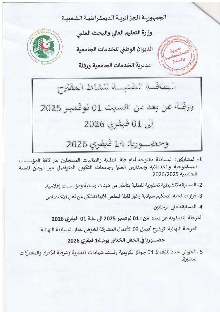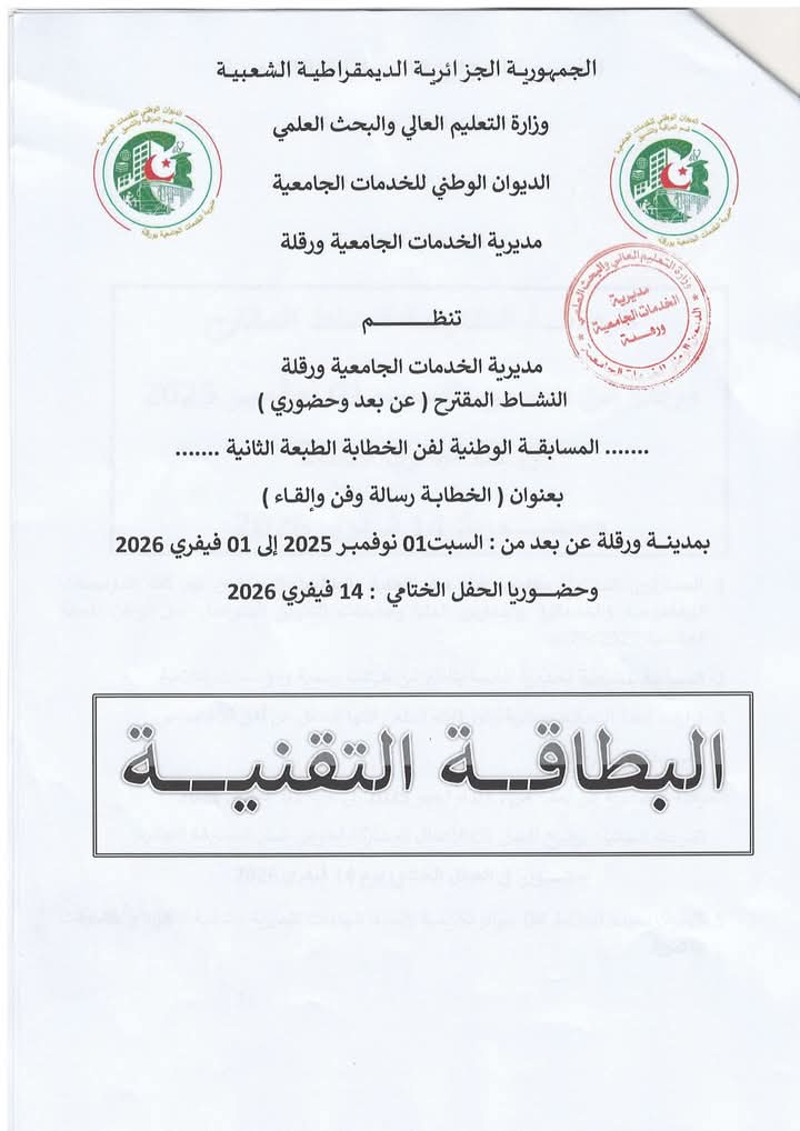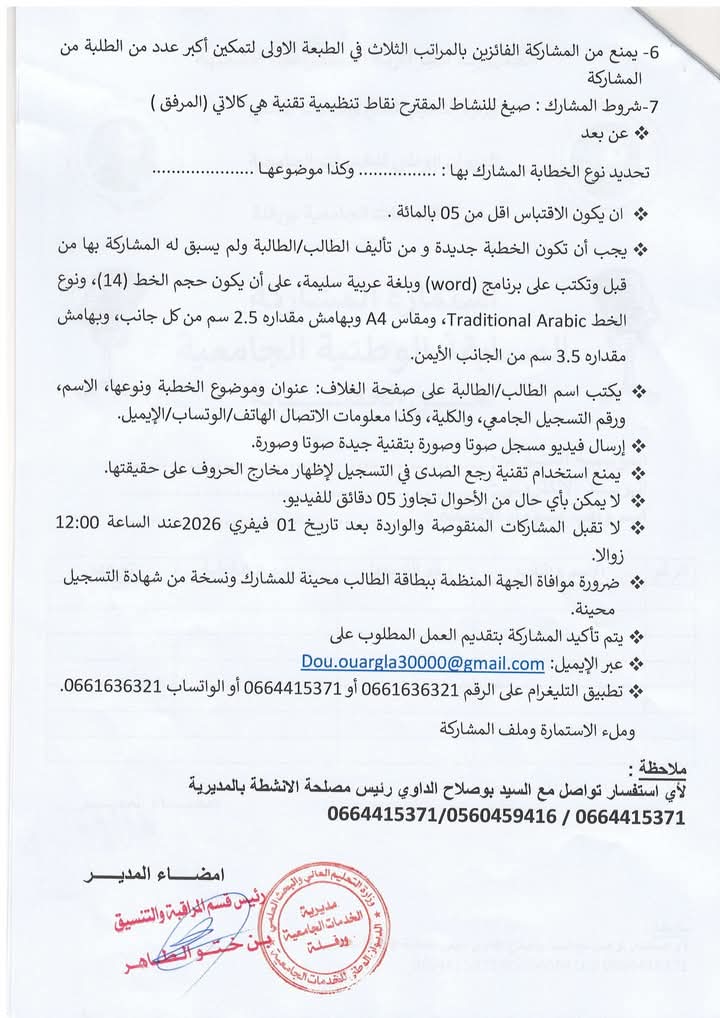 تعلم المديرية الفرعية للانشطة العلمية الثقافية و الرياضية جميع طلبة جامعة حسيبة بن بوعلي الشلف الراغبين في المشاركة و تمثيل الجامعة في الطبعة الثانية للمسابقة الوطنية الجامعية لفن الخطابة و الإلقاء التقرب من مصالح الانشطة العلمية الثقافية و الرياضية على مستوى الكليات و المعهدين أو مقر المديرية الفرعية للأنشطة العلمية الثقافية و الرياضية المتواجدة بمديرية الجامعة من أجل التسجيل قبل تاريخ 01 فيفري 2026مرفوقين بالشهادة المدرسية للموسم الجامعي 2026/2025