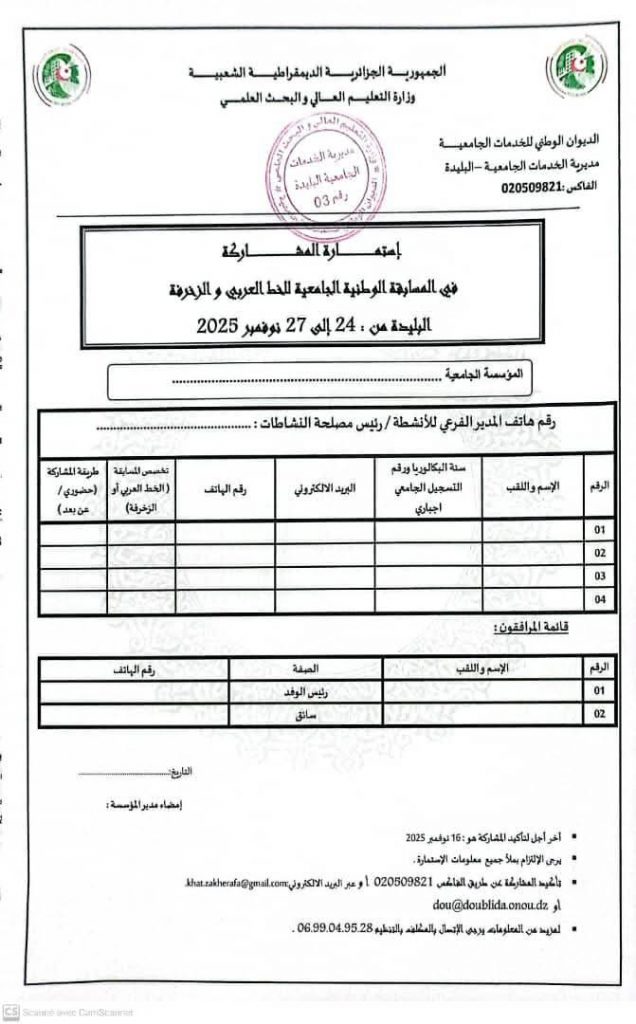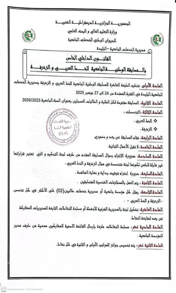 تعلم المديرية الفرعية للانشطة العلمية الثقافية و الرياضية جميع طلبة جامعة حسيبة بن بوعلي الشلف الراغبين في المشاركة و تمثيل الجامعة في الطبعة العاشرة للمسابقة الوطنية الجامعية للخط العربي و الزخرفة التقرب من مصالح الانشطة العلمية الثقافية و الرياضية على مستوى الكليات و المعهدين أو مقر المديرية الفرعية للأنشطة العلمية الثقافية و الرياضية المتواجدة بمديرية الجامعة من أجل التسجيل قبل تاريخ 15 نوفمبر 2025 مرفوقين بالشهادة المدرسية للموسم الجامعي 2026/2025