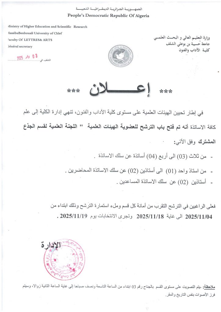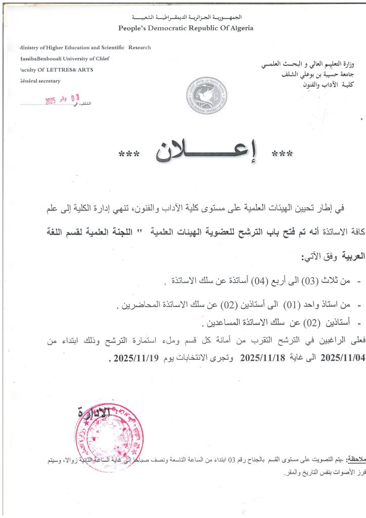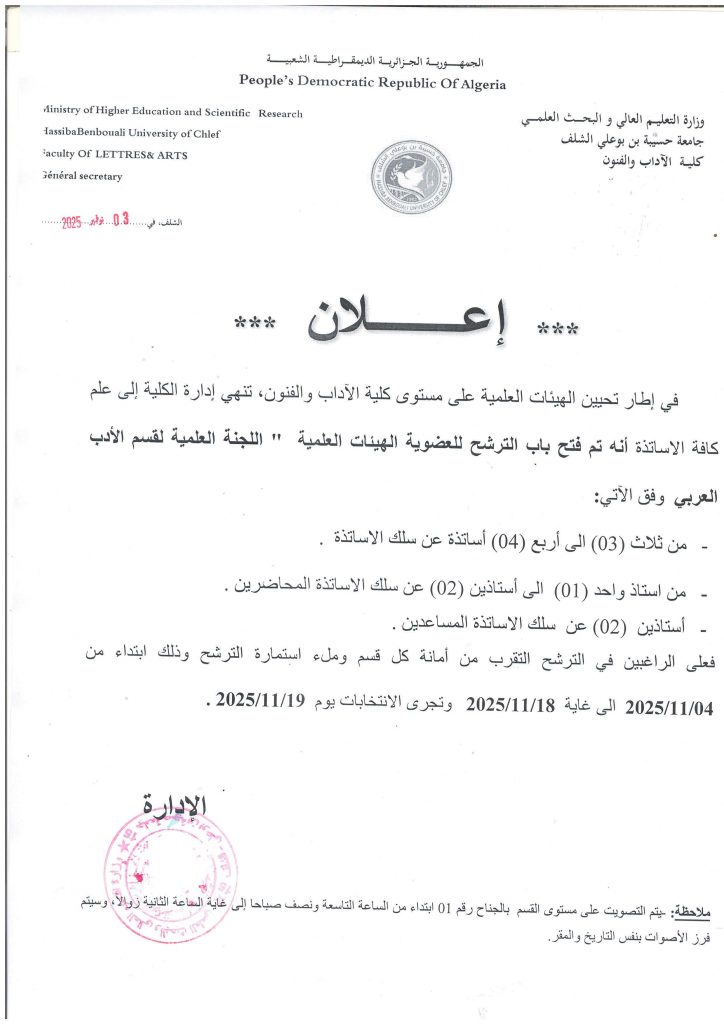 إعلان اللجنة العلميةبواسطة / 4 نوفمبر، 2025 1-قسم الادب العربي 2-قسم الجذع المشترك 3-قسم اللغة العربية