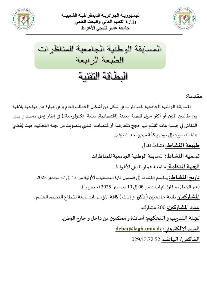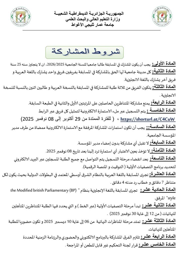 تعلم المديرية الفرعية للانشطة العلمية الثقافية و الرياضية جميع طلبة جامعة حسيبة بن بوعلي الشلف الراغبين في المشاركة و تمثيل الجامعة في الطبعة الرابعة للمسابقة الوطنية الجامعية لافضل المناظرات التقرب من مصالح الانشطة العلمية الثقافية و الرياضية على مستوى الكليات و المعهدين أو مقر المديرية الفرعية للأنشطة العلمية الثقافية و الرياضية المتواجدة بمديرية الجامعة من أجل التسجيل قبل تاريخ 08 نوفمبر 2025 مرفوقين بالشهادة المدرسية للموسم الجامعي 2026/2025