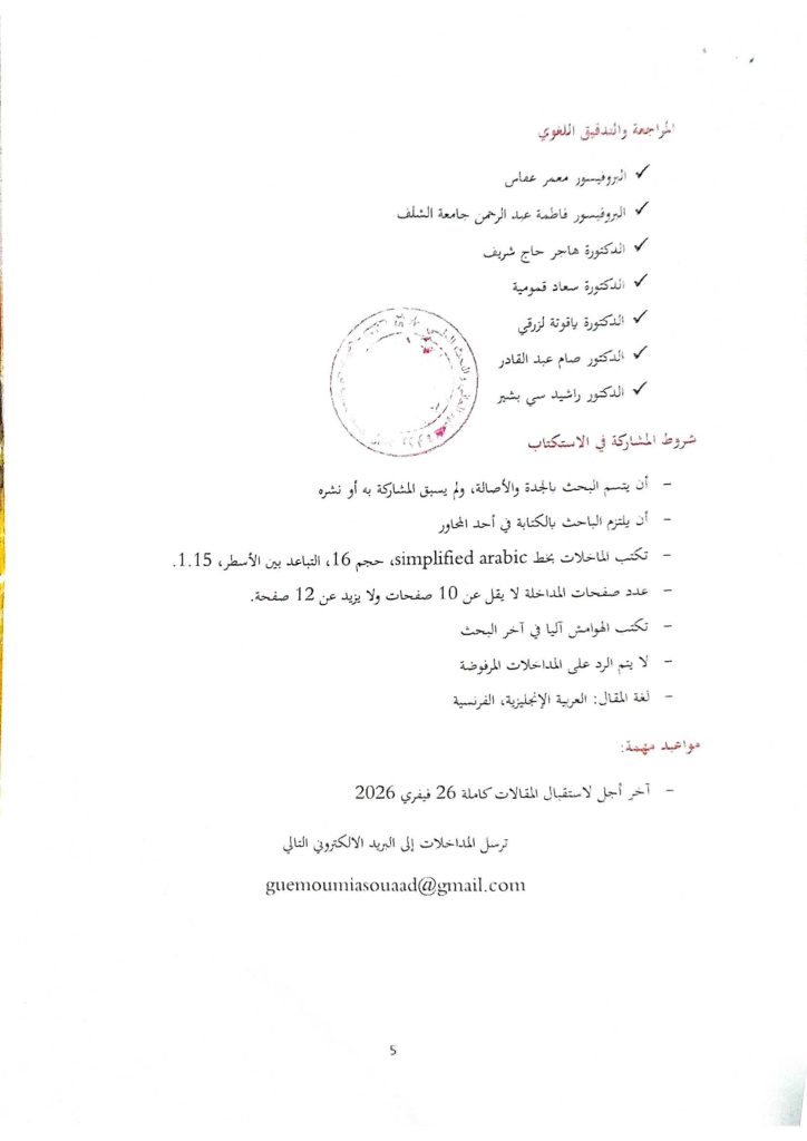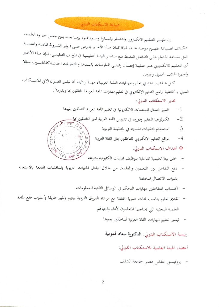 استكتاب دولي موسوم بـ:فاعلية برامج التعليم الإلكتروني في تعليم مهارات اللغة العربية للناطقين بها وبغيرهابواسطة izzeddine ameur / 7 يناير، 2026 تحميل https://drive.google.com/file/d/1fsQRhN1EfbY0uqHBddeSSCkVWNaE-j08/view?usp=sharing