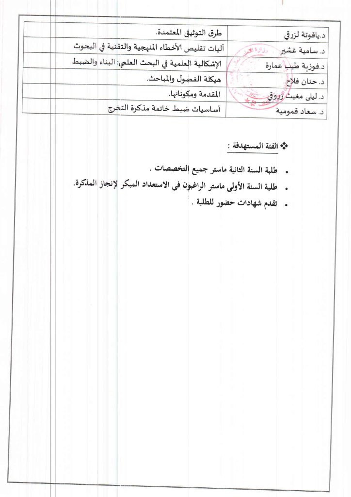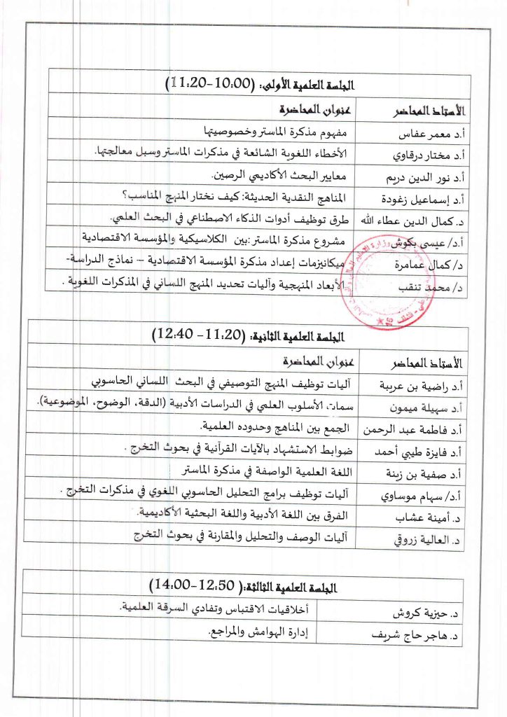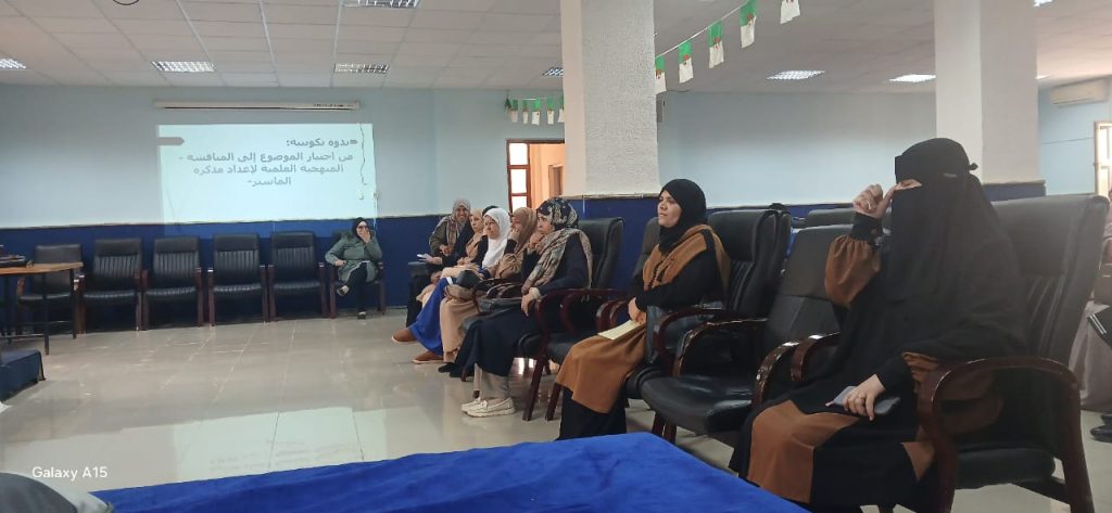 تم صباح اليوم بقاعة المحاضرات الجناح 02 الندوة التكوينية الموسومة ب :” من إختيار الموضوع إلى المناقشة المنهجيةالعلميةلإعداد مذكرةالماستر”