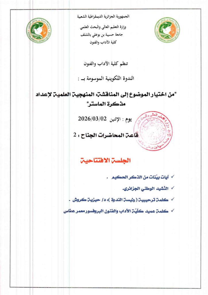 الديبباجة تم صباح اليوم بقاعة المحاضرات الجناح 02 الندوة التكوينية الموسومة ب :” من إختيار الموضوع إلى المناقشة المنهجيةالعلميةلإعداد مذكرةالماستر”بحضور […]